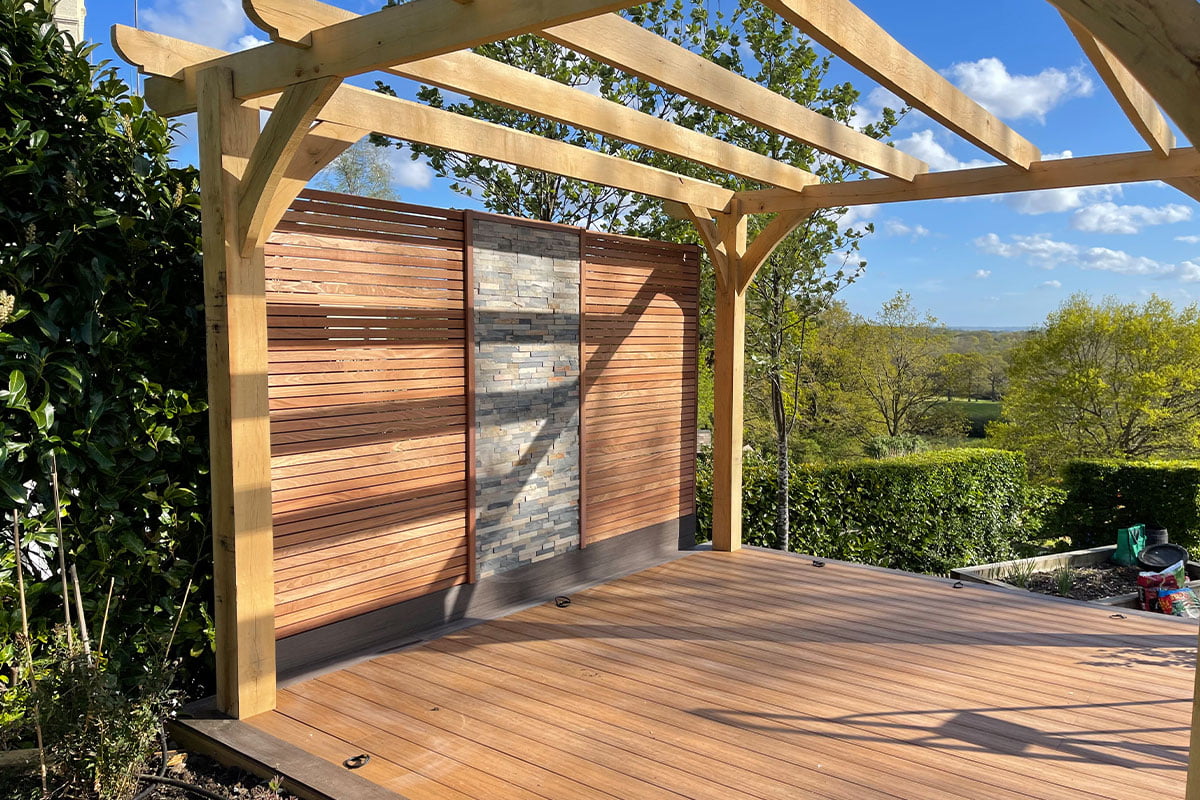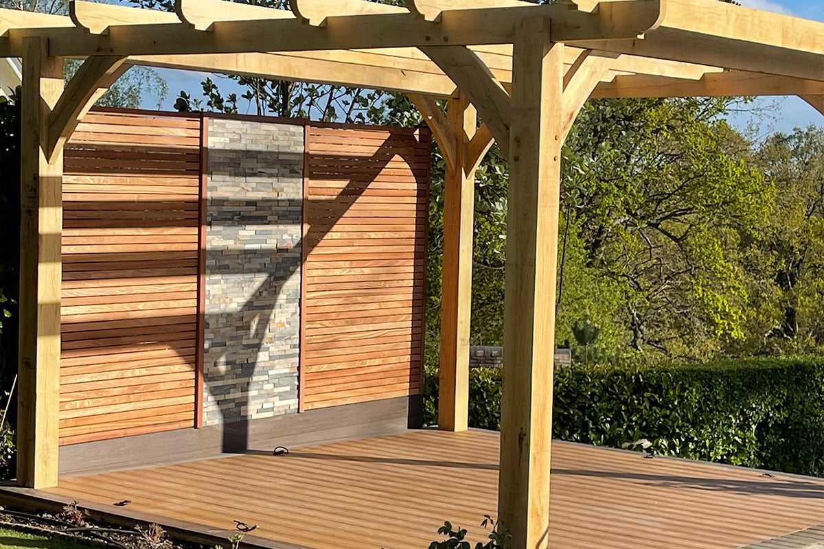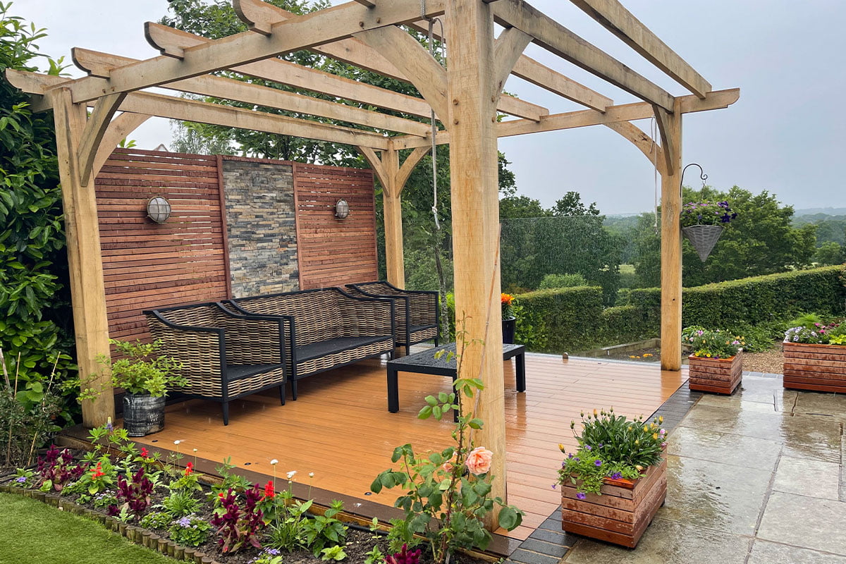 The Oak pergola was complimented with a large decking area and with storage space underneath.